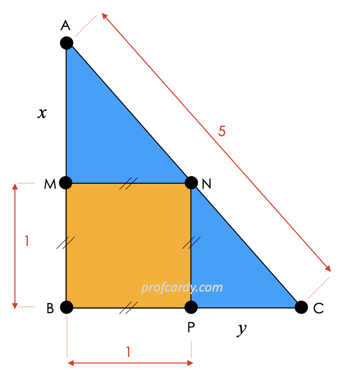 Dado o triângulo retângulo `\text{ABC}`, de hipotenusa `AC=5`, e o quadrado `\text{BPNM}` de lado `1`, obter `AM+PC=x+y`.