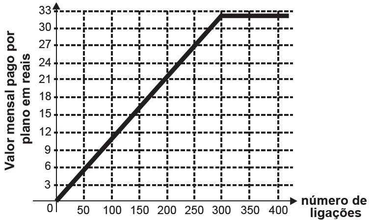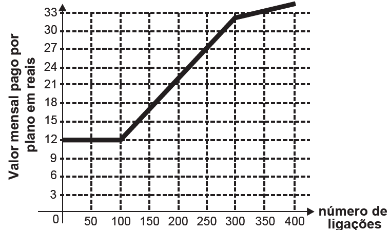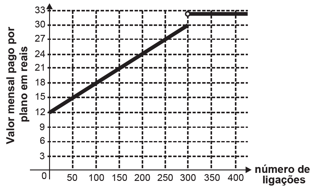 Após realizar uma pesquisa de mercado, uma operadora de telefonia celular ofereceu aos clientes que utilizavam até 500 ligações ao mês o seguinte plano mensal: um valor fixo de R$ 12,00 para os clientes que fazem até 100 ligações ao mês. Caso o cliente faça mais de 100 ligações, será cobrado um valor adicional de R$ 0,10 por ligação, a partir da 101ª até a 300ª; e caso realize entre 300 e 500 ligações, será cobrado um valor fixo mensal de R$ 32,00. Com base nos elementos apresentados, o gráfico que melhor representa a relação entre o valor mensal pago nesse plano e o número de ligações feitas é:
