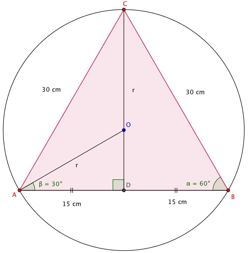 Como a base do prisma é um triângulo equilátero, indicado na figura como `ABC`, cada um de seus ângulos internos mede 60º (exemplo, `\alpha = 60º`). A altura `\bar{CD}` do triângulo determina um ângulo reto na base `\bar{AB}` no ponto `D` que também divide a base em seu ponto médio. Fazendo uso de um triângulo auxiliar `AOD` que, pelas características decorrentes de seus vértices, será retângulo, de hipotenusa de medida `r` (o raio do círculo) e um ângulo interno `\beta = 30º` (metade de 60º) e cateto `AD=15`.