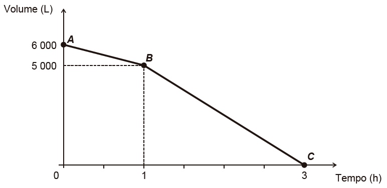 Uma cisterna de 6 000 L foi esvaziada em um período de 3 h. Na primeira hora foi utilizada apenas uma bomba, mas nas duas horas seguintes, a fim de reduzir o tempo de esvaziamento, outra bomba foi ligada junto com a primeira. O gráfico, formado por dois segmentos de reta, mostra o volume de água presente na cisterna, em função do tempo.