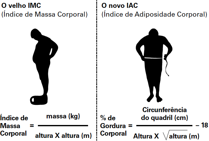 O Índice de Massa Corporal (IMC) é largamente utilizado há cerca de 200 anos, mas esse cálculo representa muito mais a corpulência que a adiposidade, uma vez que indivíduos musculosos e obesos podem apresentar o mesmo IMC. Uma nova pesquisa aponta o Índice de Adiposidade Corporal (IAC) como uma alternativa mais fidedigna para quantificar a gordura corporal, utilizando a medida do quadril e a altura. A figura mostra como calcular essas medidas, sabendo-se que, em mulheres, a adiposidade normal está entre 19% e 26%.